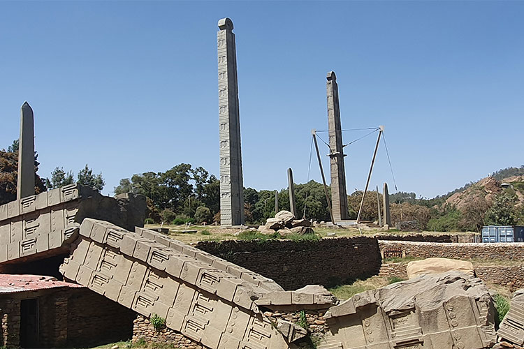 Tarihi kent meydanında onlarca steller dikkatimizi çekiyor. Aksum’daki bazı stellerin Hristiyanlık öncesine 3’üncü ve 4’üncü yüzyıla ait olduğu biliniyor. Ancak, stellerin bazıları dev obeliskler şeklinde ve burada yatan Aksum kralların mezar taşı niteliğinde. Dev obeliskler tek kaya parçasından imal edilmiş ve bu meydana dikilmiş, ağırlıkları 160-ton civarında ve yükseklikleri 27 -34 metre arasında. Bu yapıtların Aksum krallarının mezar taşı olmasının yanı sıra aynı zamanda Aksum Krallığı’nda gücünü temsil ediyorlar.