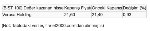 Borsa İstanbul'da, bugün BIST 100 endeksi içinde değer kazanan tek hisse senedi Verusa Holding oldu.