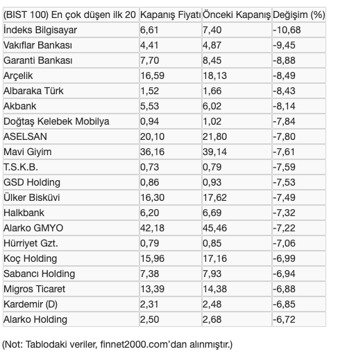 Borsa İstanbul'da, bugün BIST 100 endeksi içinde en çok değer kaybeden 20 hisse senedinin son ve önceki kapanış fiyatları ile günlük değişim oranları şöyle: