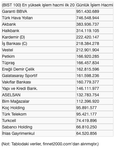 Borsa Perşembe 25 Nisan 2019 19:09 BORSADA İŞLEM HACMİ Borsa İstanbul'da, BIST 100 endeksi içinde işlem gören hisse senetleri arasında günlük işlem hacmine göre ilk 20 hisse senedi ve günlük işlem hacimleri şöyle: