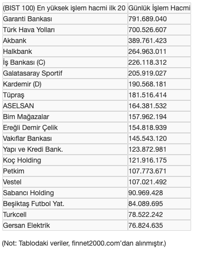 Borsa Çarşamba 24 Nisan 2019 19:07 BORSADA İŞLEM HACMİ Borsa İstanbul'da, BIST 100 endeksi içinde işlem gören hisse senetleri arasında günlük işlem hacmine göre ilk 20 hisse senedi ve günlük işlem hacimleri şöyle: