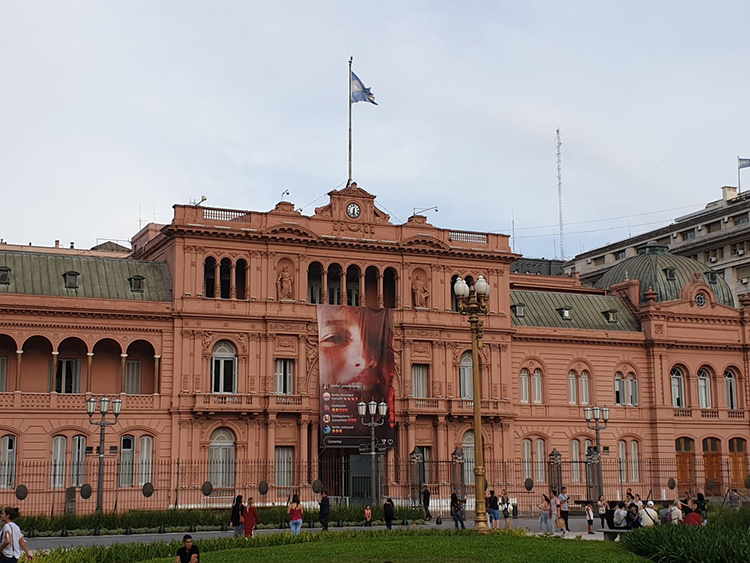 Çatısında mavi, beyaz ve sarı rengindeki Arjantin bayrağı dalgalanıyor. Arjantinlilerin meşhur ‘Evita’sının yani Eva Peron’un kalabalıklara siyasi konuşmalar yapıp Arjantin halkını peşinden sürüklediği pembe balkonu fark ediyoruz. Ölümünün üstüne yetmiş yıl geçmesine rağmen Eva Peron’un ruhunun hala halkın ve şehirin içinde yaşadığını hissediyorsunuz.