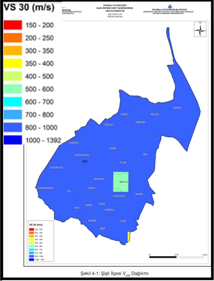 Vs30 kayma dalgası hızlarına göre ilçenin tamamını incelediğimde. İlçenin %95’inde Vs30: 1000-1382 m/sn. hızların hakim olduğunu ve zeminin gayet iyi olduğunu söyleyebilirim.