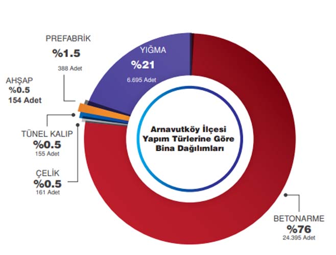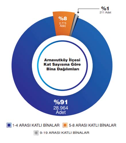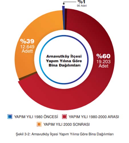 Bu grafiklerden , Arnavutköy bölgesinde yapılan binaların %61’inin , 2000 yılından önce inşa edildiğini , mevcut binaların %91’inin 1-4 kat aralığında olduğunu ayrıca mevcutbinaların %76’sının betonarme binalardan oluştuğu sonucunu çıkarabiliriz.