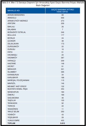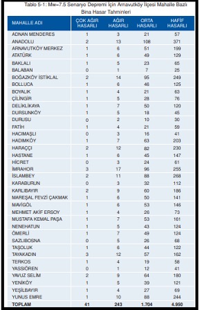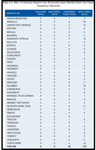 İstanbul’da beklediğimiz deprem , Mw = 7,2 – 7,6 aralığında olduğu için bu çalışmada senaryo depremimiz Mw = 7,5 kabul edilerek gerekli çalışmalar yapılmıştır. Aşağıdaki grafiklerde binalar için hasar durumları ile insanlar için ölü , yaralı sayıları ve geçici barınma ihtiyacı doğacak hane sayısı mahalle bazında verilmiştir . Bu rakamlar olası en düşük rakamlardır .