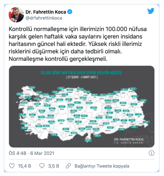 Sağlık Bakanı Fahrettin Koca, il bazında 27 Şubat - 5 Mart tarihleri arasındaki bir haftalık dönemde yeni koronavirüs vaka sayılarına ait verileri açıkladı. Veriler, illerde her 100 bin kişilik nüfusa düşen vaka sayısını gösteriyor.