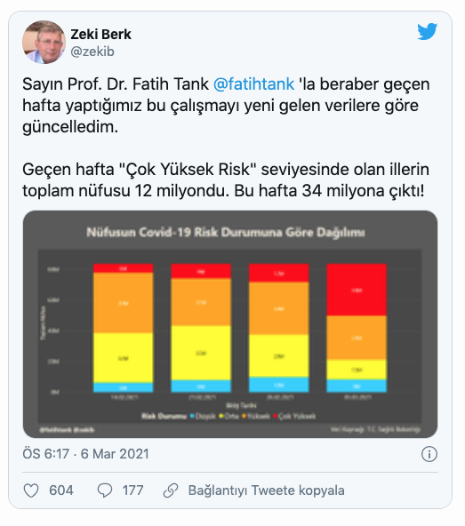 Ankara Üniversitesi İstatistik Profesörü Fahih Tarank ve yazılımcı Zeki Berk'in birlikte hazırladığı haritaya göre 26 Şubat ile biten haftada çok yüksek riskli il kategorisinin sınırı olarak belirlenen, 100 binde 100 kişiden fazlasında koronavirüsün görüldüğü illerde yaşayan kişi sayısı 12 milyondu.