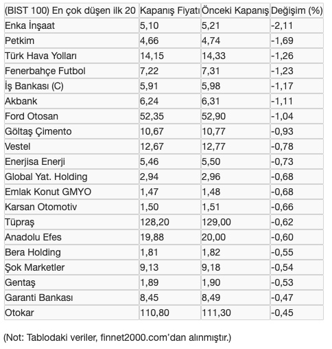 Borsa İstanbul'da, bugün BIST 100 endeksi içinde en çok değer kaybeden 20 hisse senedinin son ve önceki kapanış fiyatları ile günlük değişim oranları şöyle: