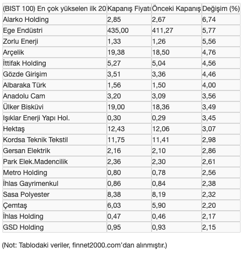 Borsa İstanbul'da, bugün BIST 100 endeksi içinde en çok değer kazanan 20 hisse senedinin son ve önceki kapanış fiyatları ile günlük değişim oranları şöyle: