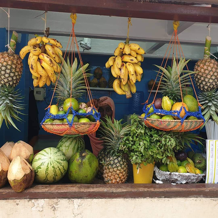 Yükselen yoğun kokular nedeniyle et ve balık pazarından hızlıca meyve ve sebze pazarına yöneliyoruz. Pazar tentelerin altında hem yağmurdan korunuyoruz hem de tezgahlarda bulunan çeşit çeşit meyvelerden tadıyoruz. Pazarda muz, ananas, Hindistan cevizi, rambutan, mango, durian, baobab, avocado, papaya, passion fruit, jackfruit, guava, pomelo gibi meyveleri ve bilumum vanilya, siyah, beyaz, yeşil biber, tarçın, karanfil, kakule, zencefil ve zerdeçal gibi yerel baharatları inceleyip, alış verişler yapıyoruz.