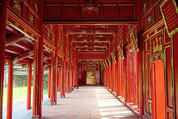 Geçmişteki olağanüstü yüz altmış büyük tarihi saray yapı kompleksinden ne yazık ki 1968’deki Vietnam Savaşı sonrasına ancak on tarihi kompleks kurtarılabilmiştir. Kale duvarlarındaki kurşun izleri hala Vietnam Savaşı’nın bu hüzünlü günlerini bize anlatıyor. Kalenin girişinde Vietnam’ın en yüksek bayrak direğinde kırmızı sarı Vietnam bayrağı dalgalanıyor. Kaleiçi'ne giriyoruz. Fazla bir restorasyon çalışması yapılmadığı için tarihi kalıntıları yıpranmış ama orijinal haliyle görebiliyoruz. Büyük arklardan ve rengârenk bir ana giriş kapısından saray kompleksinden içeri doğu yürüyoruz. Her şey sanki daha yeni terk edilmiş gibi görünüyor, o kadar gerçekçi ki, oysa Vietnam Monarşisi 1945 de burayı terk etmişti.