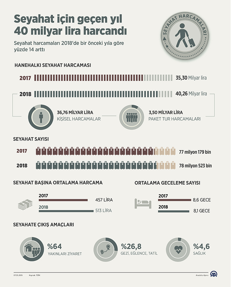 Seyahat harcamaları 2018'de bir önceki yıla göre yüzde 14 artarak 40 milyar 266 milyon 153 bin