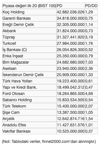 BIST 100 endeksine dahil ve piyasa değeri açısından en büyük 20 şirketin piyasa değeri ile piyasa değeri/defter değeri oranları şöyle: