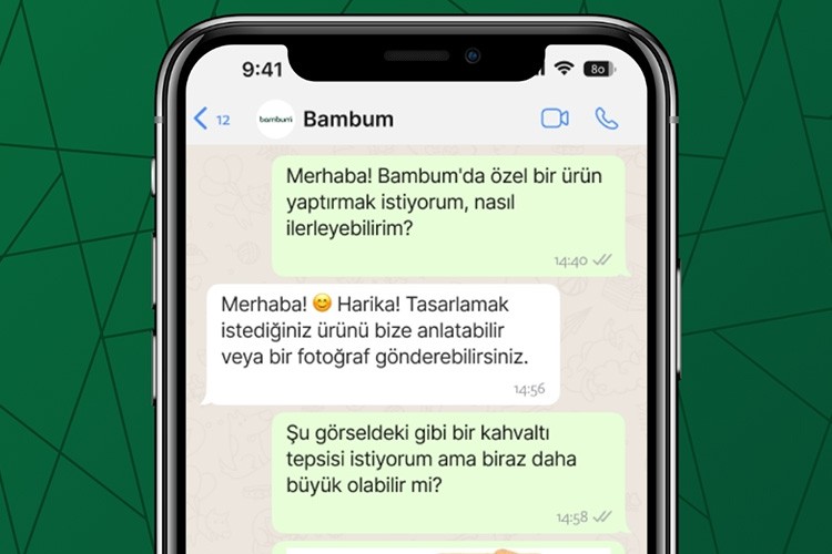 Bambum’un WhatsApp Ürün Tasarım Hattı üzerinden iletişime geçerek istedikleri ürünü detaylı bir şekilde tarif eden kullanıcılar, Bambum’un uzman tasarım ekibi tarafından değerlendirilerek kişiye özel bir tasarım haline getiriliyor. Üretim tamamlandıktan sonra ortaya çıkan ürün, hem eşsiz hem de tamamen kullanıcının hayal gücünü yansıtıyor.