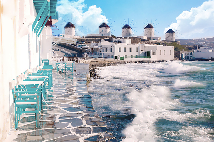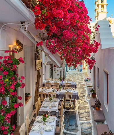 Mykonos, Yunan bayrağından almış olduğu beyaz ve mavi renklerin hakim olduğu, son derece romantik , muhteşem manzaralara sahip, sokakları, havası ve denizi mis gibi çok bakımlı bir ada . Sokaklarında kaybolmak istersiniz, şahane butik dükkanlar, muazzam gurme ve Grek tarzında çok şık restoranlar ve bahçeler , harika çiçeklerle ve ağaçlarla özenle süslenmiş teraslar sizi büyüler. Evlerin bembeyaz merdiven basamaklarında bile rengarenk çiçek kutuları görürsünüz . Gözünüzü rahatsız edecek hiç bir unsura denk gelmezsiniz. Ada müthiş güzel bir harmoni ve sadelik içinde dekore edilmiş. En güzeli elbette direkt deniz kenarında bulunan yel değirmen ve gün batımı manzaralı ahşap geleneksel sandalye ve masaların bulunduğu , Grek müziğin tatlı tatlı çaldığı ve olağanüstü lezzetlerde mezelerin ve yemeklerin servis edildiği meyhanelerdir .