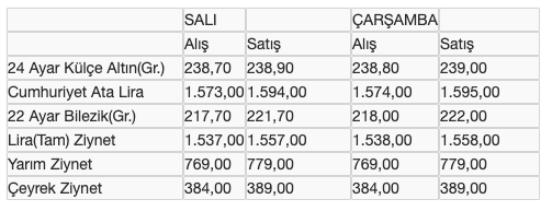 İstanbul Kapalıçarşı'da alınıp satılan altın türlerinin, önceki ve bugün itibarıyla kapanış fiyatları (TL) şöyle: