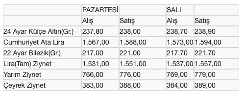 İstanbul Kapalıçarşı'da alınıp satılan altın türlerinin, önceki ve bugün itibarıyla kapanış fiyatları (TL) şöyle: