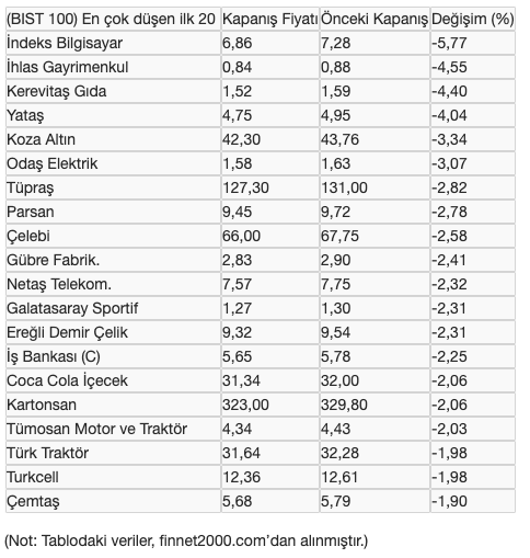 Borsa İstanbul'da, bugün BIST 100 endeksi içinde en çok değer kaybeden 20 hisse senedinin son ve önceki kapanış fiyatları ile günlük değişim oranları şöyle: