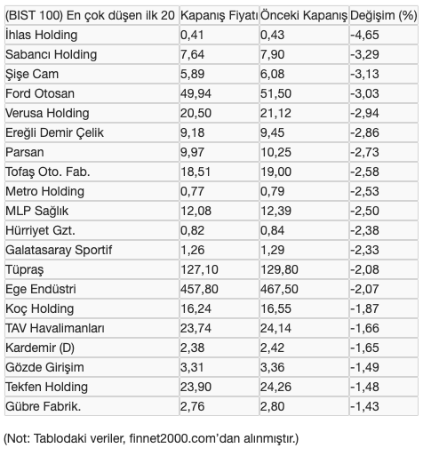 Borsa İstanbul'da, bugün BIST 100 endeksi içinde en çok değer kaybeden 20 hisse senedinin son ve önceki kapanış fiyatları ile günlük değişim oranları şöyle: