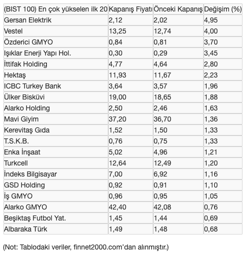 Borsa İstanbul'da, bugün BIST 100 endeksi içinde en çok değer kazanan 20 hisse senedinin son ve önceki kapanış fiyatları ile günlük değişim oranları şöyle: