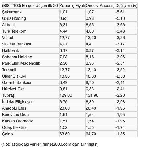 Borsa İstanbul'da, bugün BIST 100 endeksi içinde en çok değer kaybeden 20 hisse senedinin son ve önceki kapanış fiyatları ile günlük değişim oranları şöyle: