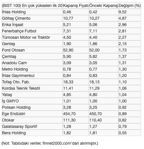 Borsa İstanbul'da, bugün BIST 100 endeksi içinde en çok değer kazanan 20 hisse senedinin son ve önceki kapanış fiyatları ile günlük değişim oranları şöyle: