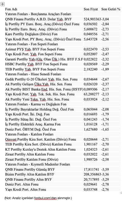 Yatırım fonları arasında kategorilere göre günlük en fazla kaybettiren fonlar şöyle: