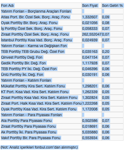 Yatırım fonları arasında kategorilere göre günlük bazda en fazla kazandıran fonlar şöyle: