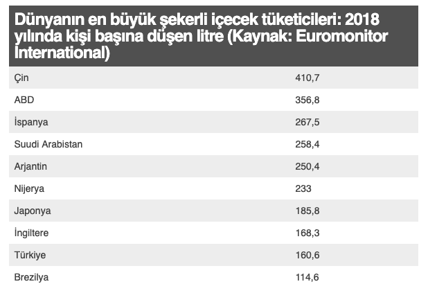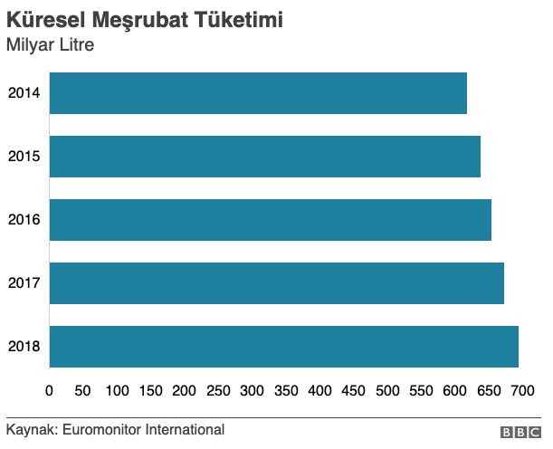 Pazar araştırma şirketi Euromonitor International, 2018'de küresel yıllık meşrubat tüketiminin kişi başına ortalama 91,1 litre olduğunu açıkladı. Bu rakam 5 yıl önce 84,1 litreydi.