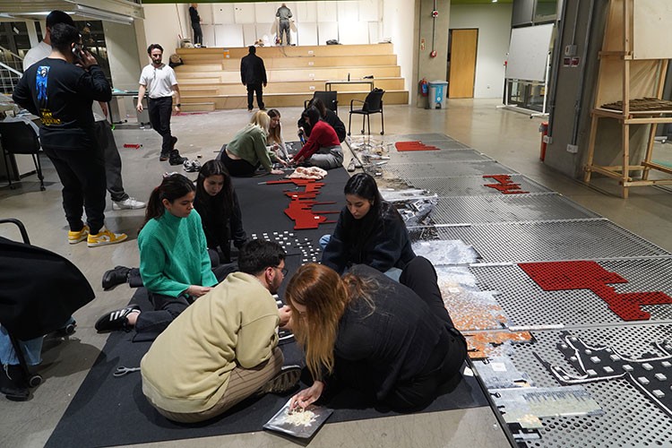 Dersin dördüncü ve son aşamasında dijital olarak tasarlanan bütün katmanlar, ilgili üretici firmalara iletilerek imalata dönüştürüldü. Üç günlük yoğun bir montaj sürecinin ardından son ürün Hangar amfisinin duvarında yerini aldı. Oluşturulan enstalasyonda, ziyaretçiler ve Hangar’da eğitim gören tüm öğrenciler için interaktif bir arayüz bırakılmasını sağladık. Bu sayede enstalasyonun değişken, eğlenceli ve dinamik bir yüzey olmasını hedefledik. Emeği geçen tüm destekçilere, yürütücülere ve katılımcı öğrencilere sonsuz teşekkür ediyoruz”.