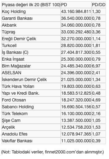 BIST 100 endeksine dahil ve piyasa değeri açısından en büyük 20 şirketin piyasa değeri ile piyasa değeri/defter değeri oranları şöyle: