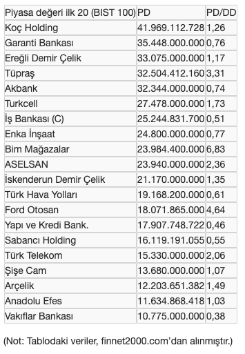 BIST 100 endeksine dahil ve piyasa değeri açısından en büyük 20 şirketin piyasa değeri ile piyasa değeri/defter değeri oranları şöyle: