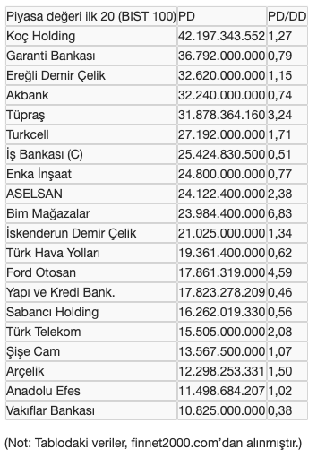 BIST 100 endeksine dahil ve piyasa değeri açısından en büyük 20 şirketin piyasa değeri ile piyasa değeri/defter değeri oranları şöyle: