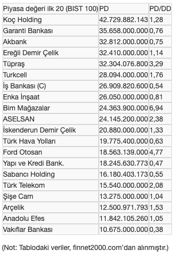 BIST 100 endeksine dahil ve piyasa değeri açısından en büyük 20 şirketin piyasa değeri ile piyasa değeri/defter değeri oranları şöyle: